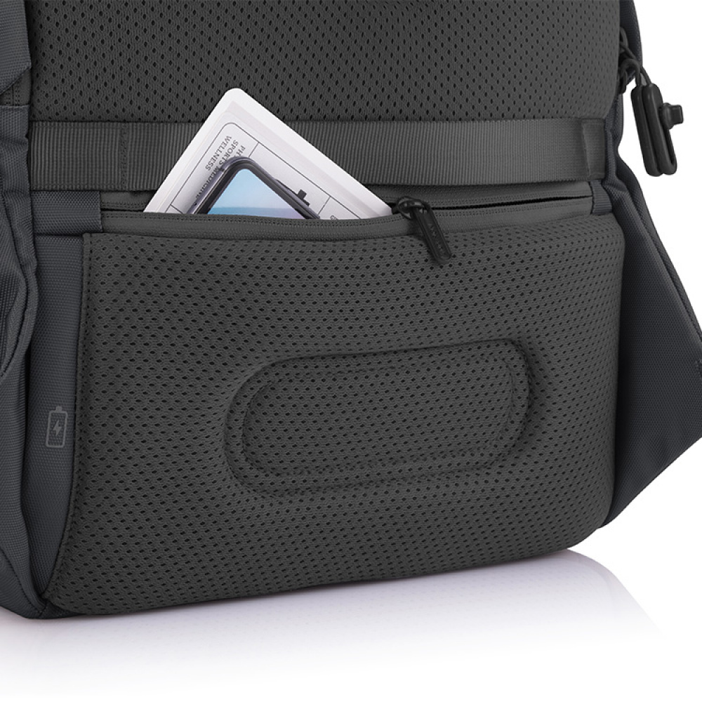 If you own a Powerbank, you can use the integrated USB port. Place the Powerbank in the rucksack and connect it to the socket inside the rucksack. Then connect your mobile phone's charging cable to the USB socket on the outside. You can now charge your phone with the Powerbank safely inside the rucksack. NB! Powerbank not included.