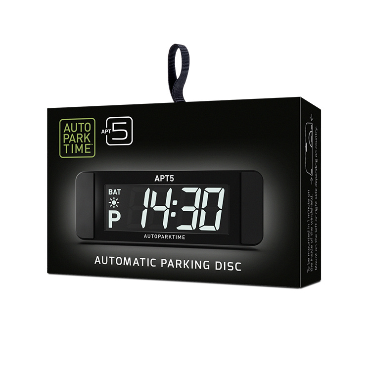 Autoparktime APT5 is a compact and discreet automatic parking disc with a clear LCD display that sets the correct time for you. It has a long battery life of up to three years and provides a clear warning when the battery level is low. The parking disc automatically adjusts between summer and winter time and can be mounted quickly in just one minute with a convenient self-adhesive magnetic mount.