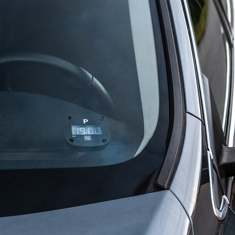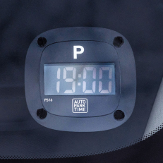 The parking disc Autoparktime has an advanced motion sensor that detects when the car is in motion. When you have found a parking spot and are still for 20 seconds, Autoparktime first shows the current time. After another 20 seconds, it locks the time to the nearest full/half hour (according to applicable parking regulations).The display then shows this time until you drive away with the car again, and the time resets after the car has been in motion for 20 seconds.