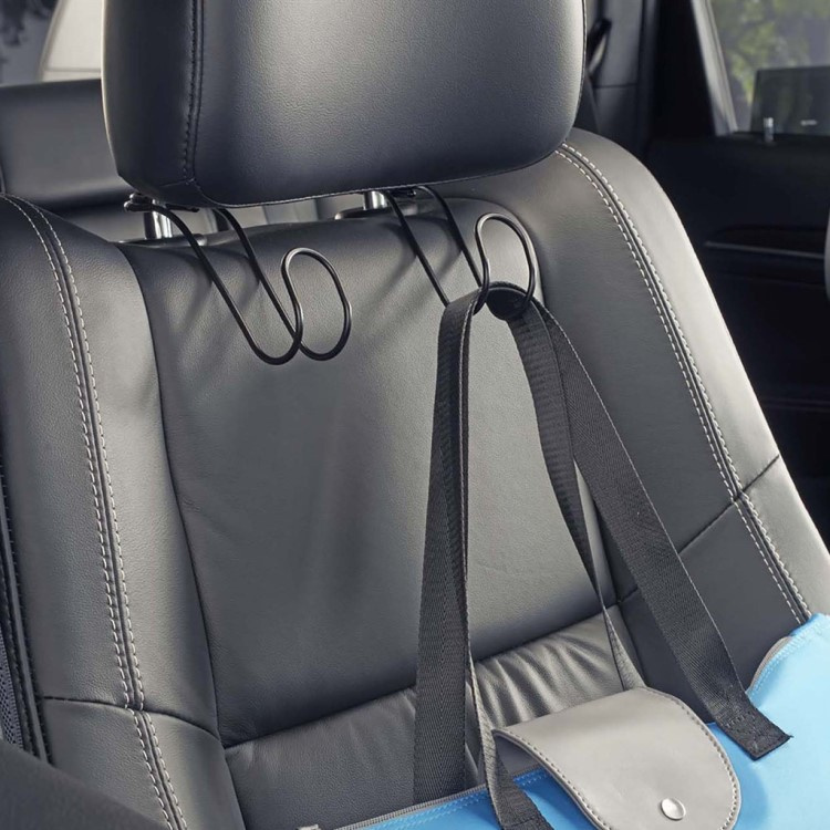 To hang up the bag hooks pull the metal wires apart and fasten the hooks to the headrest. The bag hooks can hang forwards or backwards and are perfect for hanging on the front seat headrest.