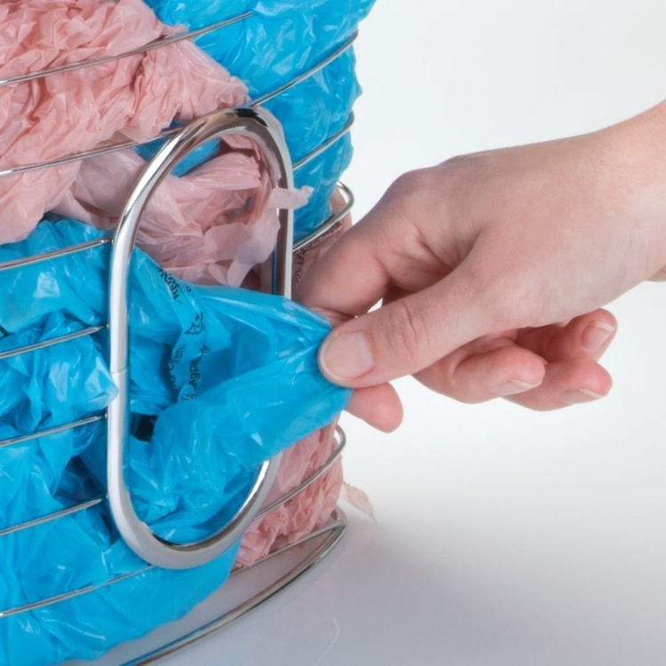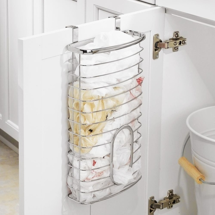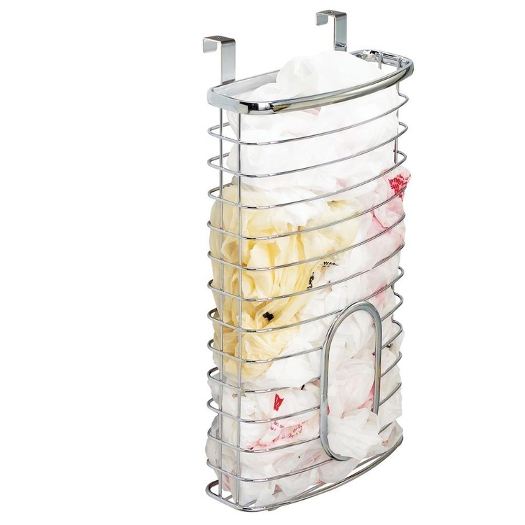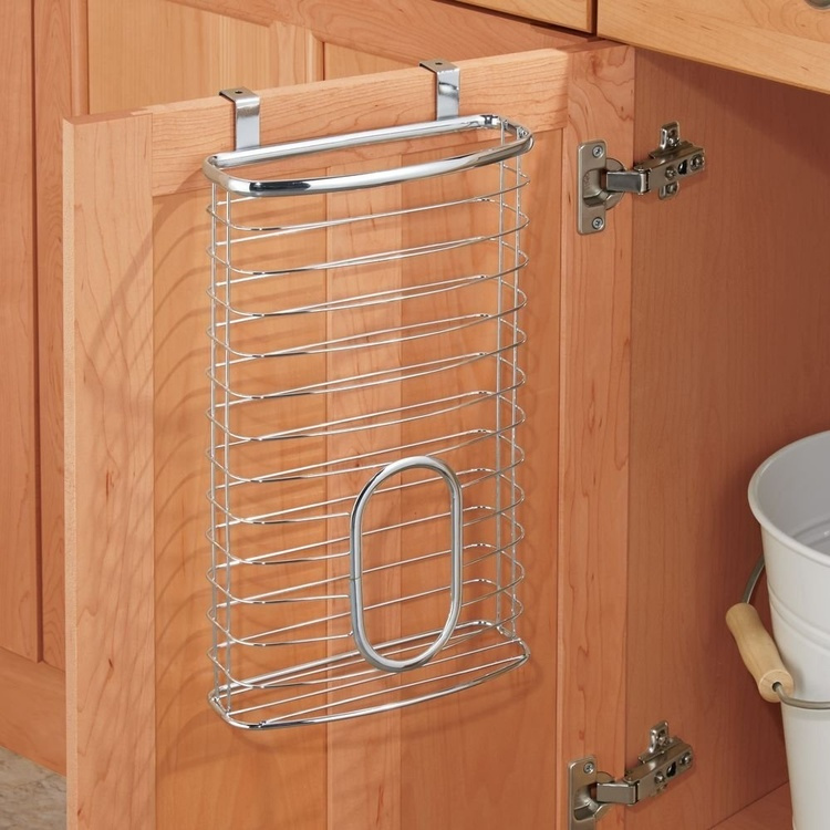 A simple and stylish solution for storing plastic bags in your kitchen from Inter Design. Hang the basket directly on the door, simple, no drill holes and easy to move. Suitable for ordinary kitchen cabinets.