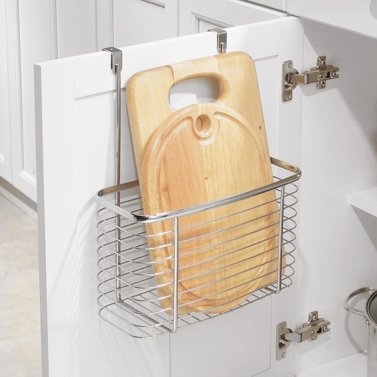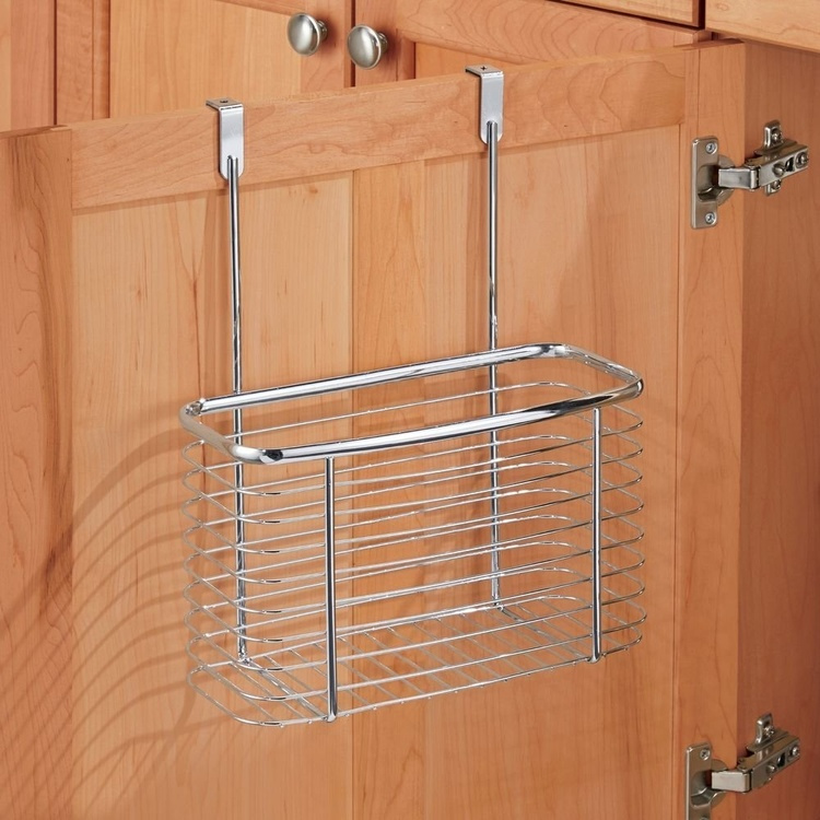 Take advantage of the cupboard door in the kitchen, bathroom or laundry room. Polished chromed steel storage basket is easily hung over the cabinet door. Provides good space for packaging such as detergent, various cleaning agents and accessories.