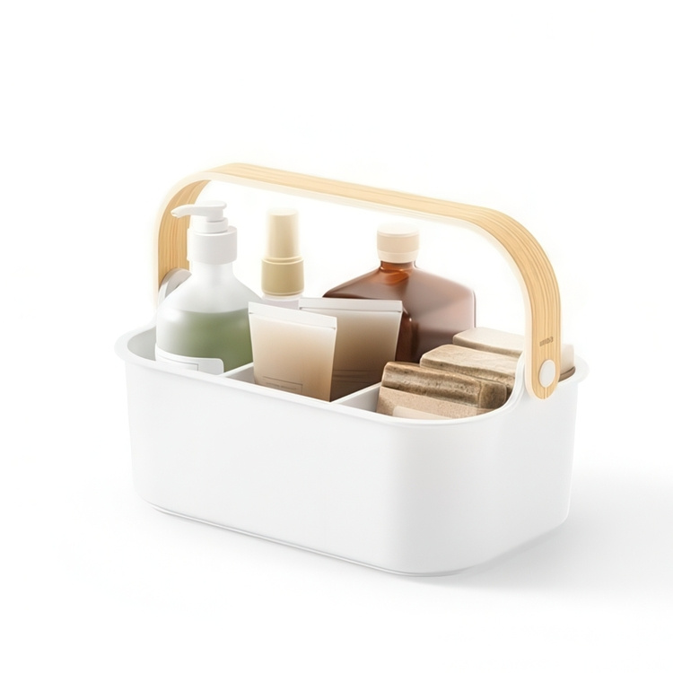 A practical basket with compartments and wooden handle. Easy to transport around the home.