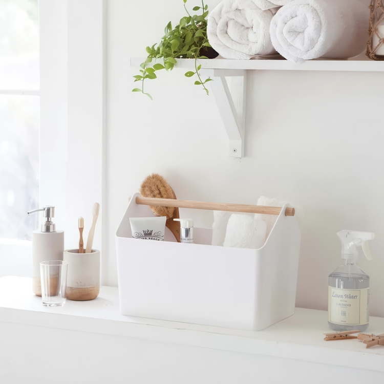 A stylish basket with wooden handle from Japanese Yamazaki. Can be used for storage for many things and many rooms. -