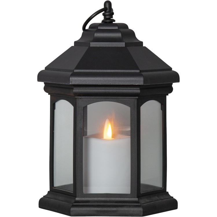 The energy-saving LED lamp has 18 diodes. The pulsating light of the diodes produces a lifelike and realistic flame that shines with a warm shite glow through the transparent window of the lantern.Lantern for garden, balcony & patio
