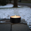 The battery-powered garden candle is made of black sheet metal and wax. Avoid placing the candle in direct sunlight on hot days, as the wax risks melting from the heat.