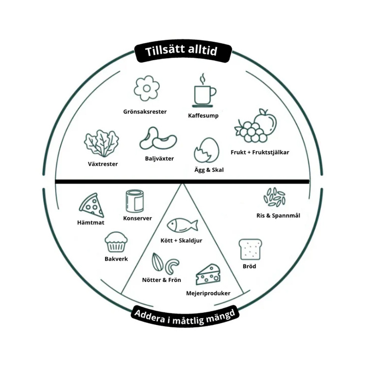 Bioblend is designed to break down a wide range of organic waste. In addition to fruit and vegetable scraps, it can also handle meat, fish, dairy products, bread, coffee filters, eggshells and some garden waste. For best results, it is good to mix different types of waste. Large fruit and vegetable cores, larger twigs and meat bones should be avoided to avoid damaging the bottom of the blender.Fast composting all year round