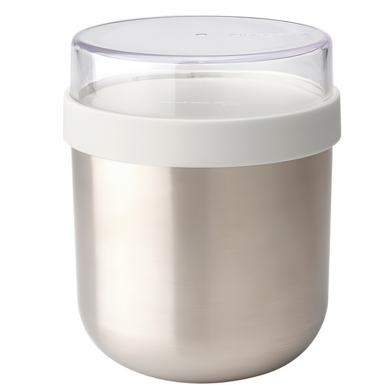 Fill the 0.5 liter jar with youghurt or soup and don't worry about yogurt spills or soggy granola. The jar has a transparent plastic container on the top for separate storage of e.g. cereals or berries and a screw-on lid that keeps it tight.