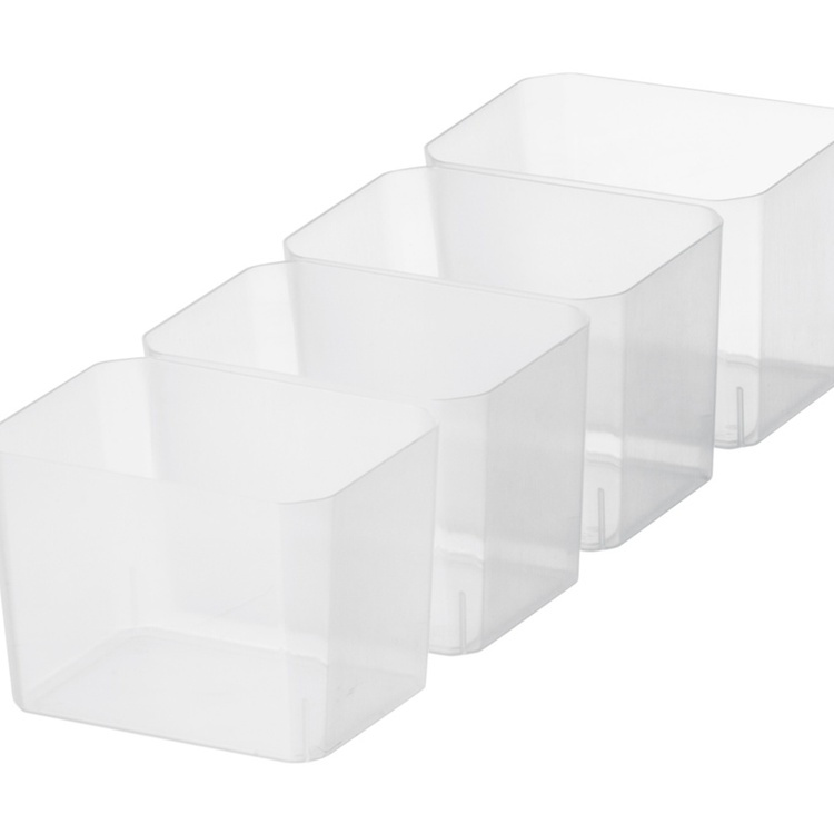 Storage box with four inserts. Perfect for storing small items such as cosmetics, pens etc. The storage boxes can be stacked on top of each other when they have the lid on. Strong clips ensure closed covers. -