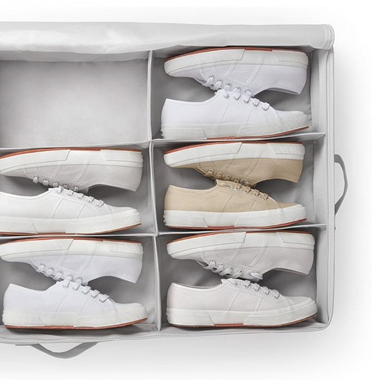 Smart under-bed storage for shoes. This box helps you organize. Divided into 6 compartments. Clear top shows you what is in the box.