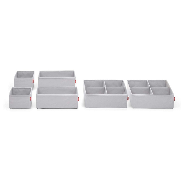Six grey boxes for sorting with dividers from Spanish Rayen. 2 pcs 14 x 14 x 10 cm + 2 pcs 14 x 28 x 10 cm + 2 pcs 28 x 28 x 10 cm. Helps to organize jewelry, stockings, or underwear.