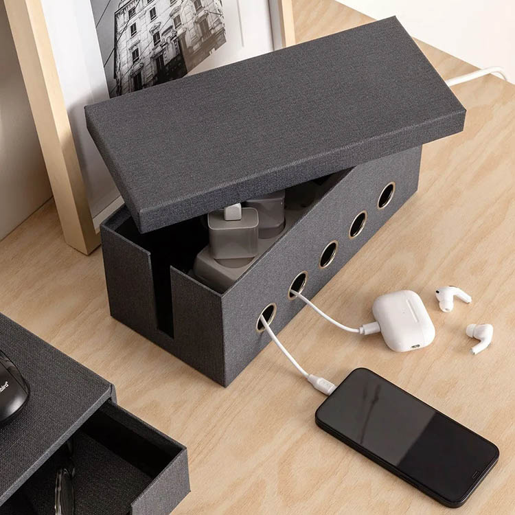 The cable hider's design allows it to neatly hide power sockets, chargers and excess cables while giving you easy access to what you need. With five holes at the front and openings on both short sides, you can easily pull out cables where you need them. This eliminates cable tangles and allows you to plug in chargers, monitors and other devices with ease. The cable hider is especially useful if you have multiple devices on your desk at the same time.Ventilation to protect your electronics