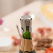 The cork is made of brushed steel and fits glass bottles with champagne, cava, prosecco, and other bubbly beverages.