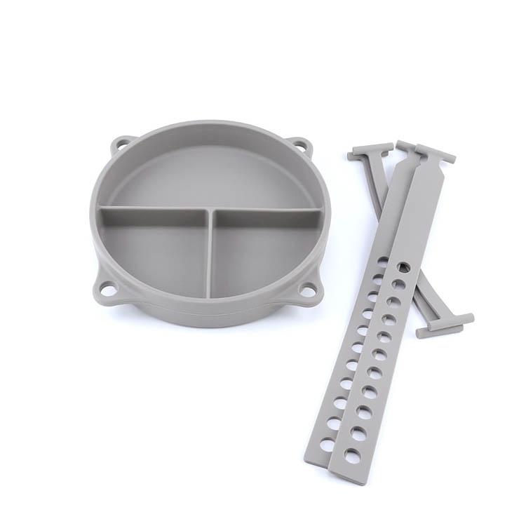 The silicone children's plate with suction cup and 4 attachments is a stable and practical solution for children learning to eat by themselves. The strong suction cup combined with the four attachment points keeps the plate securely in place throughout the meal, reducing the risk of spills and messes. The plate is made of durable and food-safe silicone and has three divided compartments that make it easy to serve different types of food.