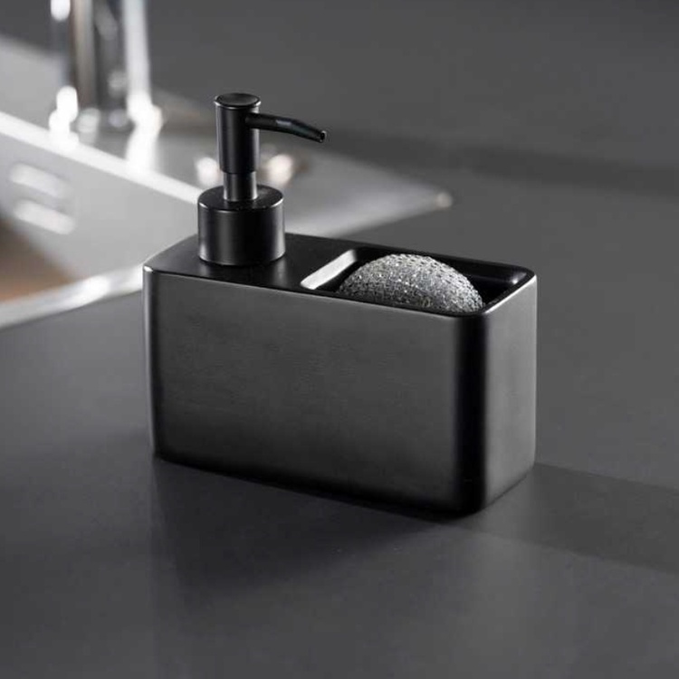 Kitchen sink soap dispenser pump in ceramic with caddy for sponge storage. -