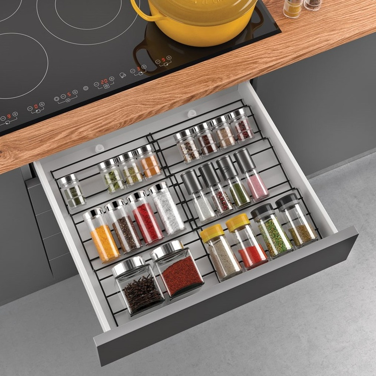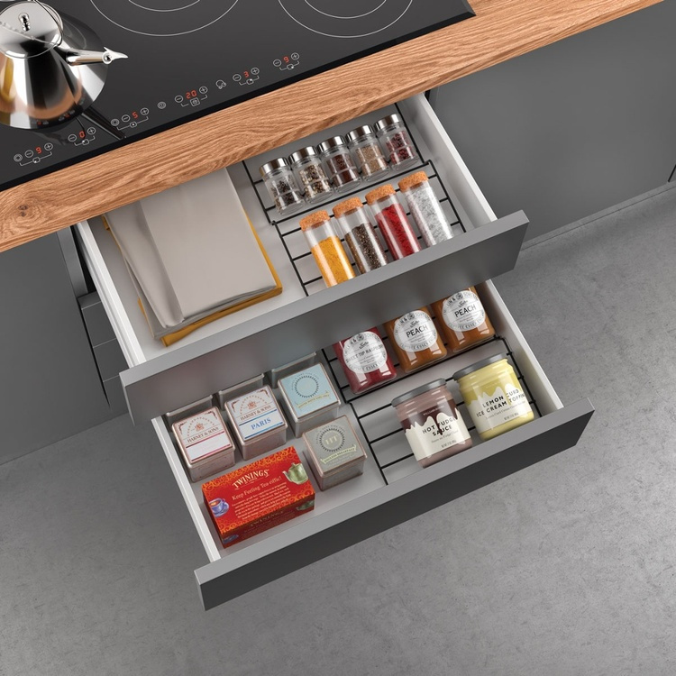 Metal spice rack for drawers. Two parts and three levels.