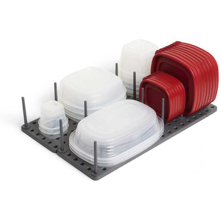 The pegs lock into onto the pegboard. Organize for example cookware and lunchboxes in different shapes and sizes. Easy to reconfigure. Set includes 2 pegboards and 16 repositionable pegs