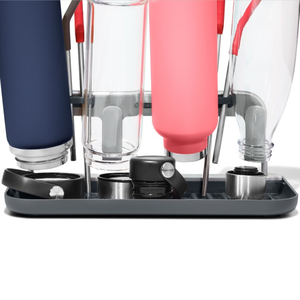The drying rack for bottles makes it easy to dry awkward water bottles, thermoses and baby bottles at home, after workouts and at work. The drying rack has four holders for bottles, a large drip tray where you can place the lids and two holders for a total of four straws.