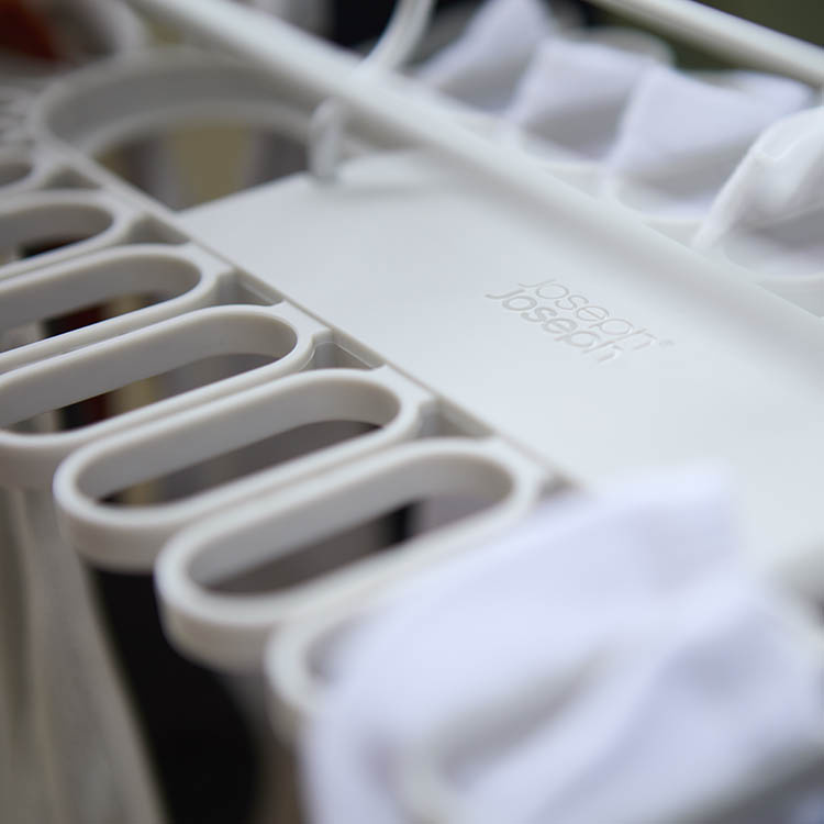 Drying rack from Joseph Joseph for easy drying of small garments such as socks and underwear. Thanks to its innovative push-grip design it's easy to quickly and effortlessly fix each garment by pushing it into place. The dryer's sturdy aluminium hooks allow it to be used both indoors and outdoors. For storage, the drying rack can be easily folded up.
