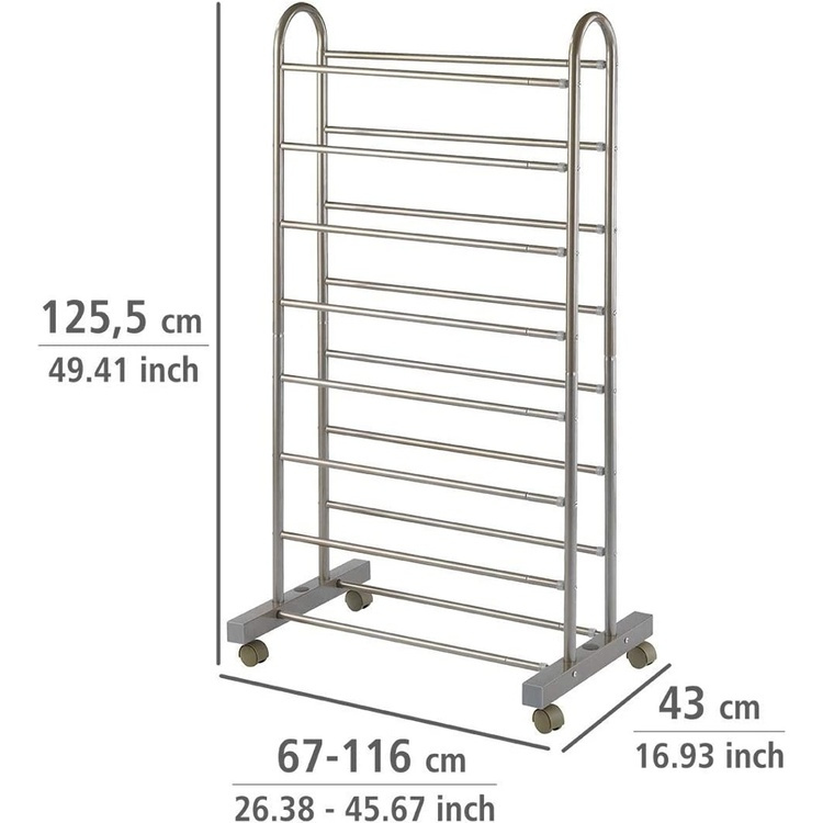 Expandable shoe rack in metal with castors.