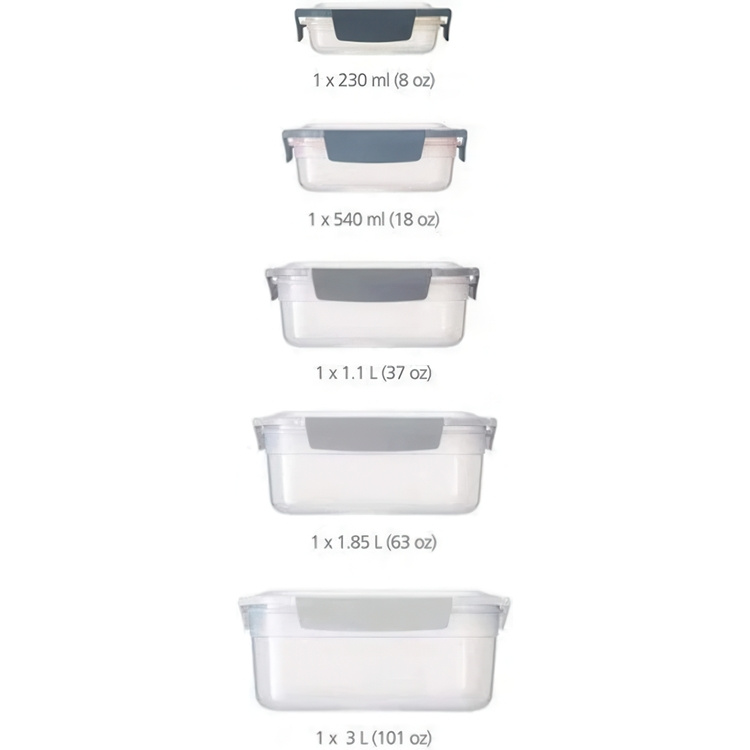 Set of five practical plastic food box that can be stored in each other. Great way to save space.