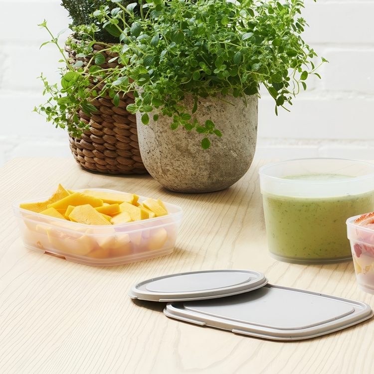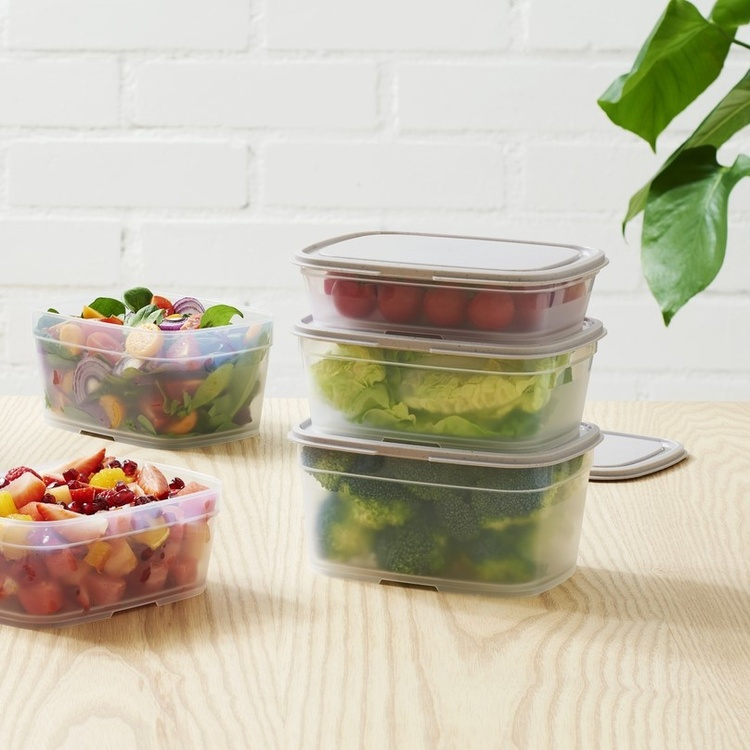 Airtight containers that can be stacked inside each other if empty and on top of each other in the refrigerator.
