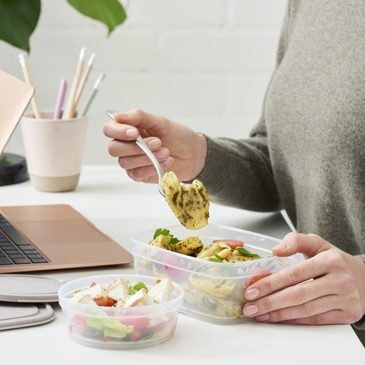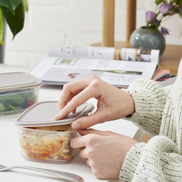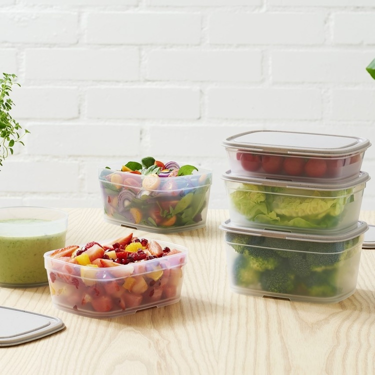 Airtight containers that can be stacked inside each other if empty and on top of each other in the refrigerator.