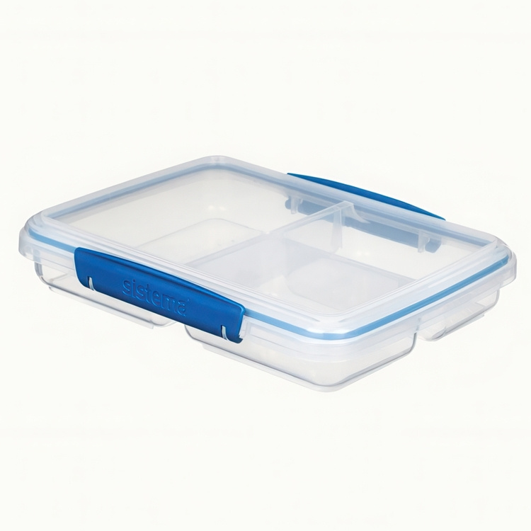 Food Storage box, 3 Compartments, SISTEMA MULTI SPLIT TO GO, 23 x 17 x H 4,3 cm, Clear / Blue