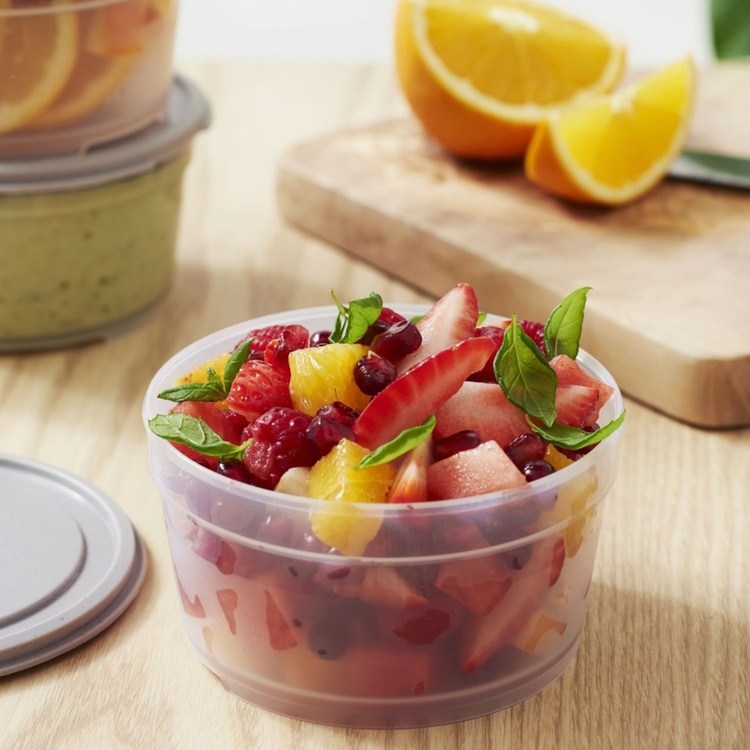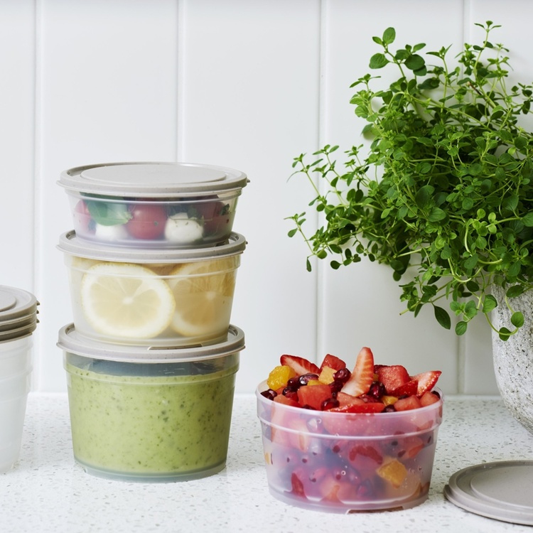 Airtight containers that can be stacked inside each other if empty and on top of each other in the refrigerator.
