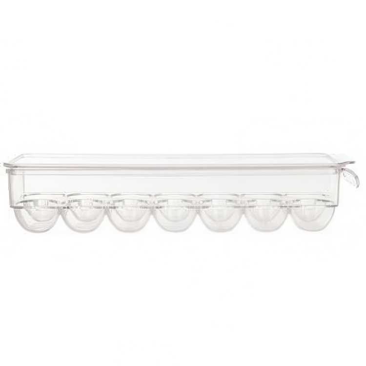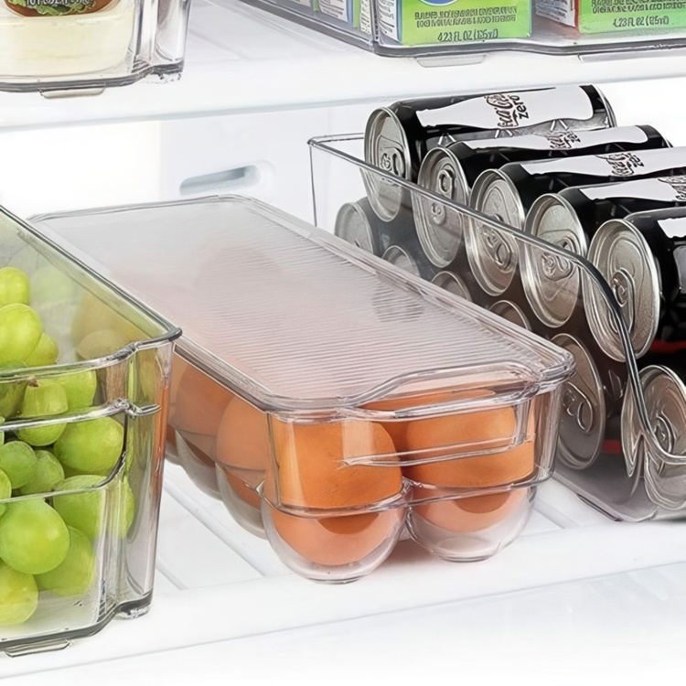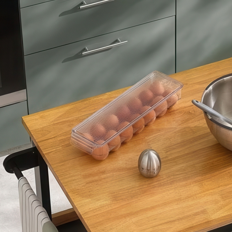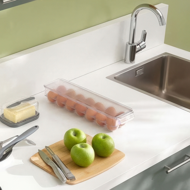 A practical kitchen storage container for up to 14 eggs.