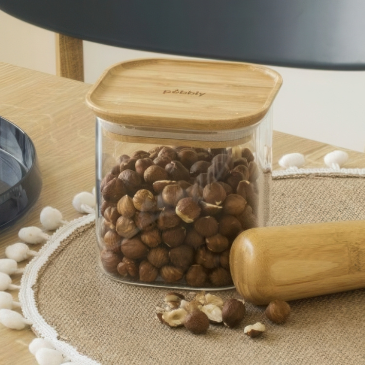 Glass Canisters, 0,8 L, Set of 3, PEBBLY SQUARE SMALL, Clear / Bamboo