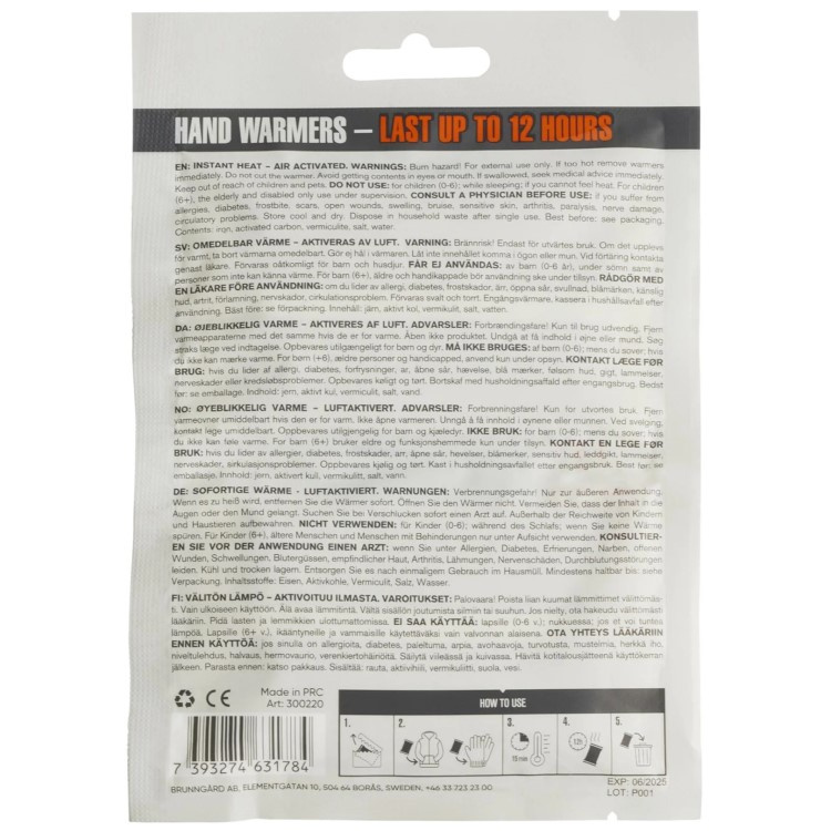 Open the bag to activate the hand warmer. The warmer is activated when it comes into contact with oxygen and heats up to an average temperature of 55 °C. Keeps your hands warm for up to to 12 hours.Single use. When you have finished with the hand warmer dispose of it in a household rubbish bin.