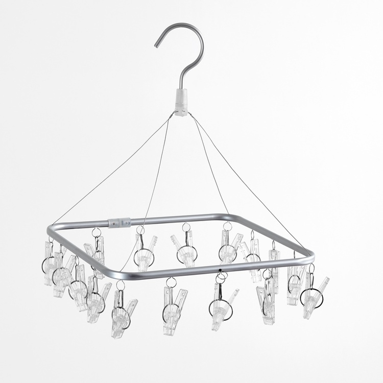 A small portable hanging laundry dryer made from aluminium with sixteen clothespins. Fit a lot on a small surface