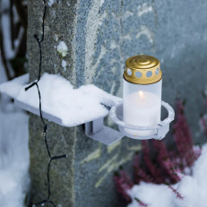 A common challenge with candles is that they may become invisible under snow or topple in strong winds. This holder solves the problem by attaching directly to the gravestone. The light comes up a bit and is thus kept both stable and visible – a safe solution all year round.Easy installation