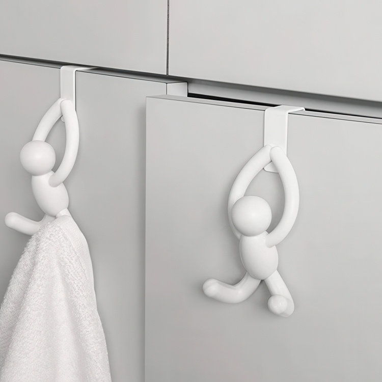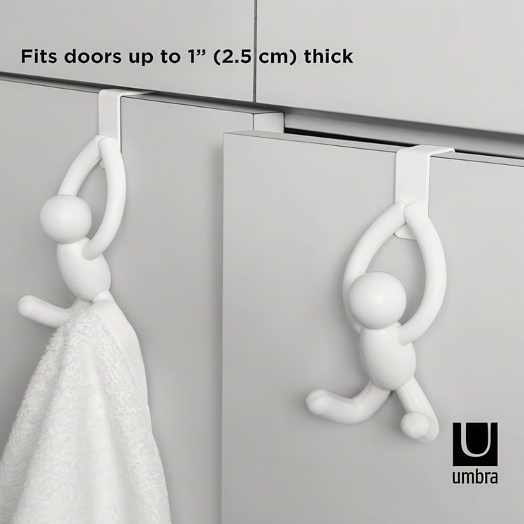 The two playful Buddy over cabinet door hooks utilize unused space to hold items.