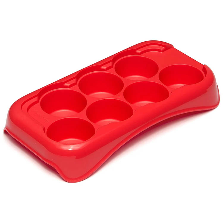 Nicetray stands on four legs, which lift the cups off of the shelf and make it easier to be emptied. You can pop out one at a time, or do the classic twist to get all 7 out. These trays can be stacked in the freezer or, if turned, piled in a box. The high edges prevent spillage and contribute to round, large, and difficult to melt ice cubes.