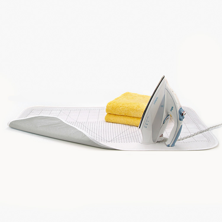 The ironing mat is 60 centimetres x 90 centimetres and can be used on all flat, non-sensitive surfaces. You can iron on both sides of the mat, and each side serves a different purpose.