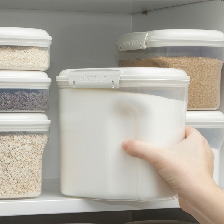 A jar designed for practical storage of flour, grains and other ingredients for baking. Tight-fitting but easy-open lid. Cup included. The shape of the jar allows for a firm grip. . Easy to stack and therefore takes up little space.