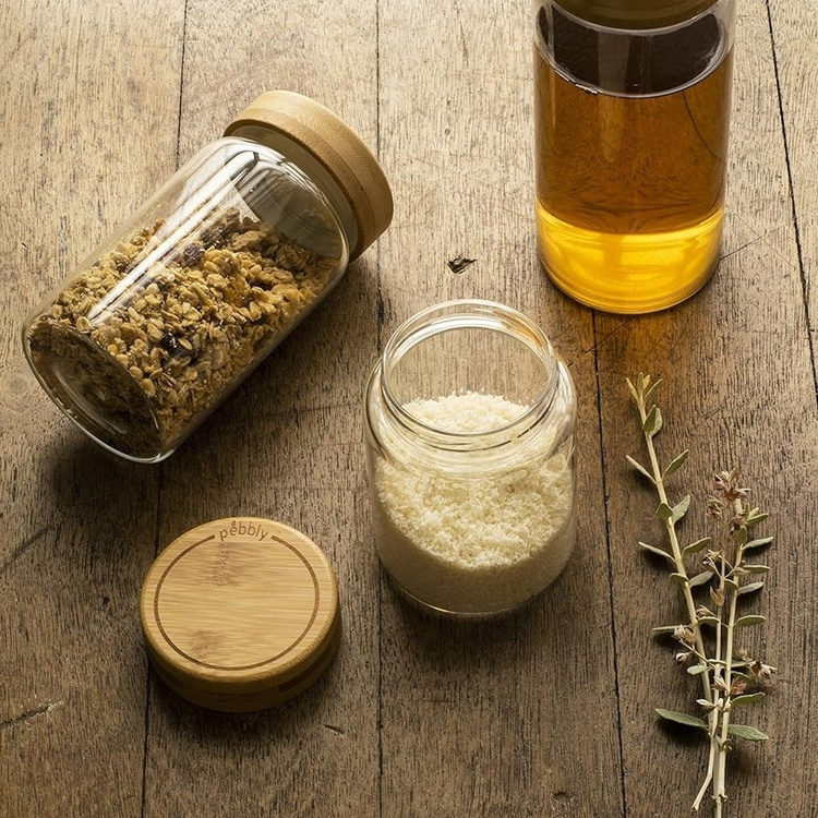 Borosilicate glass is a strong and safe type of glass for food contact. It will not alter the taste of your food and is durable over time. These jars are oven, microwave and dishwasher safe (without lids). The bamboo cover provides a modern and natural touch to your shelves. -