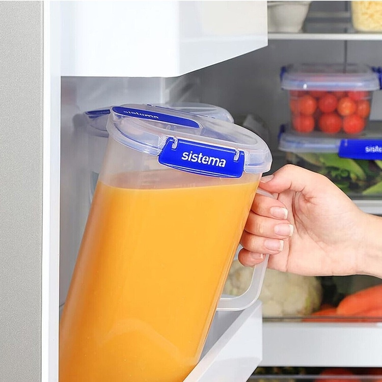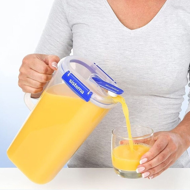 A pitcher with a lid that fits in the refrigerator, can be frozen, taken on a picnic, can be dish washed. You do not have to be afraid that the drink will spill out when you moving about.