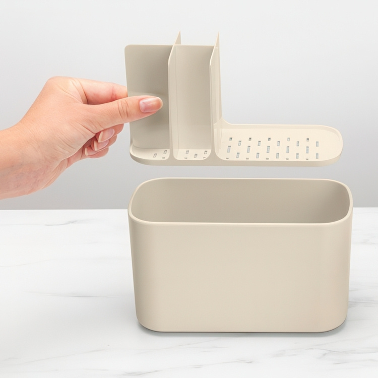 A toothbrush caddiy with different sections for organising a variety of oral care items such as manual or electric toothbrushes and toothpaste tubes.