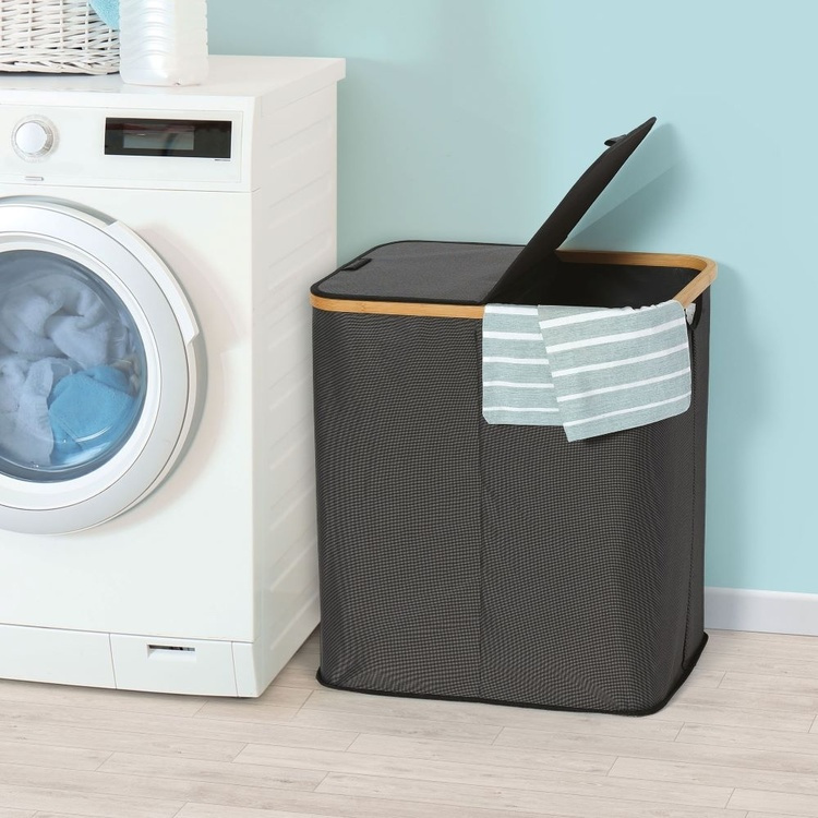 Laundry basket, 2 Compartments, PORTABIANCHERIA DOPPIO, 54 x 34 x H 58,5cm, Grey / Bamboo