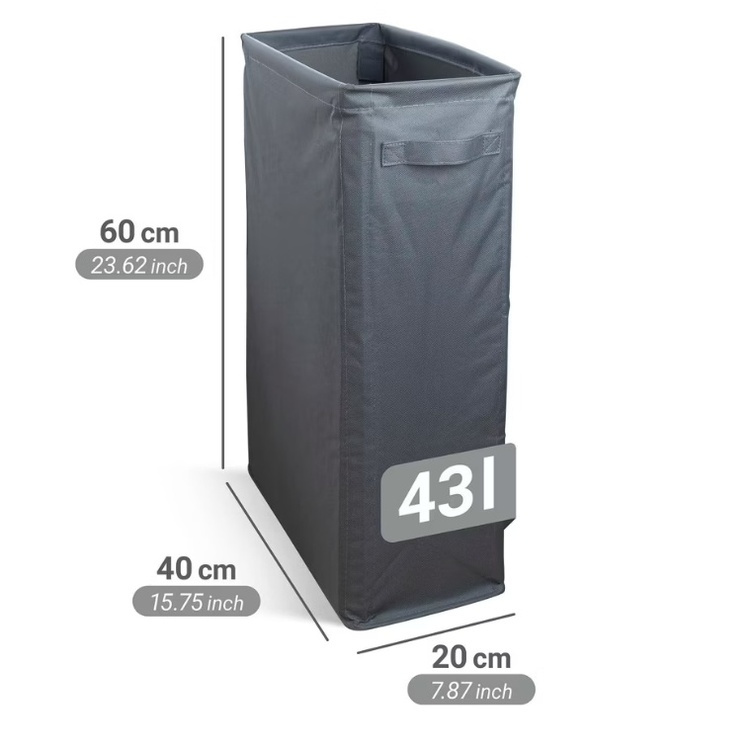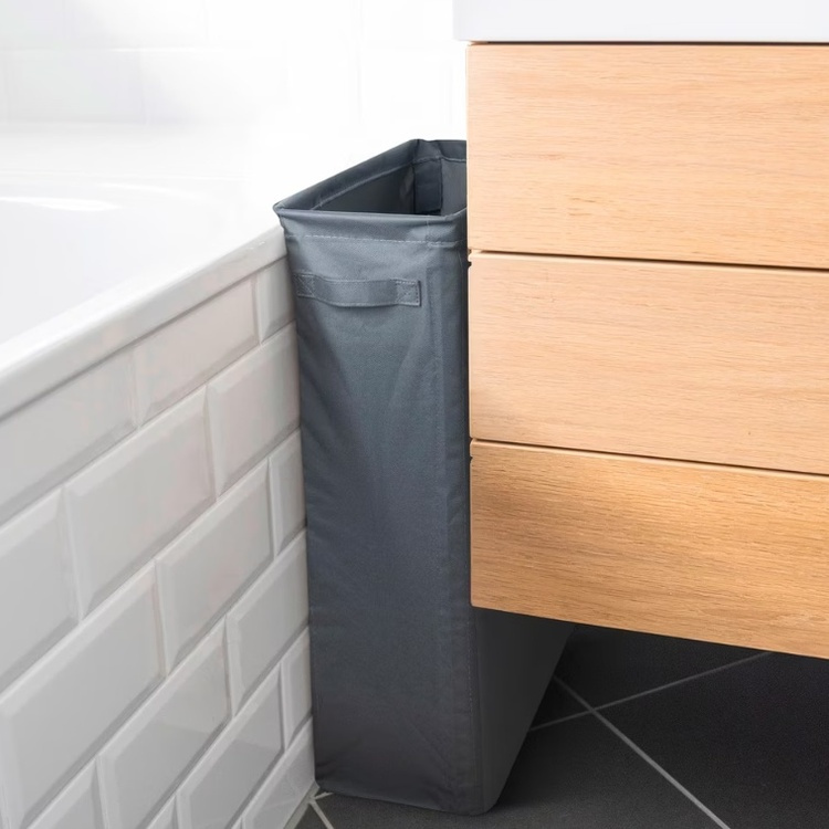 The laundry basket Slim is an extra narrow, practical laundry basket that can fit in small spaces where otherwise the surface is limited. Now you can, for example, use the surface between cabinets and shelves or cabinets and wall.
