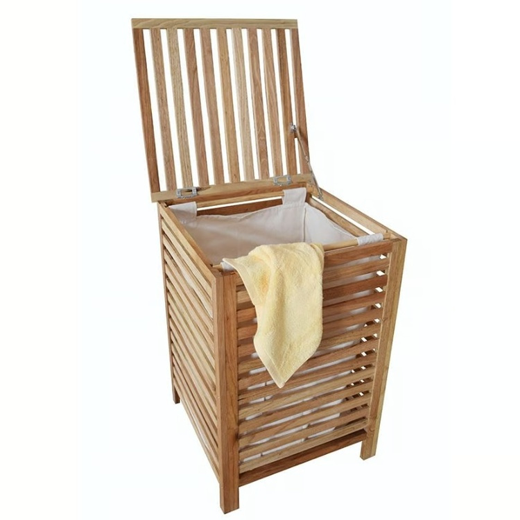 A laundry basket made of walnut wood with a laundry bag inside.
