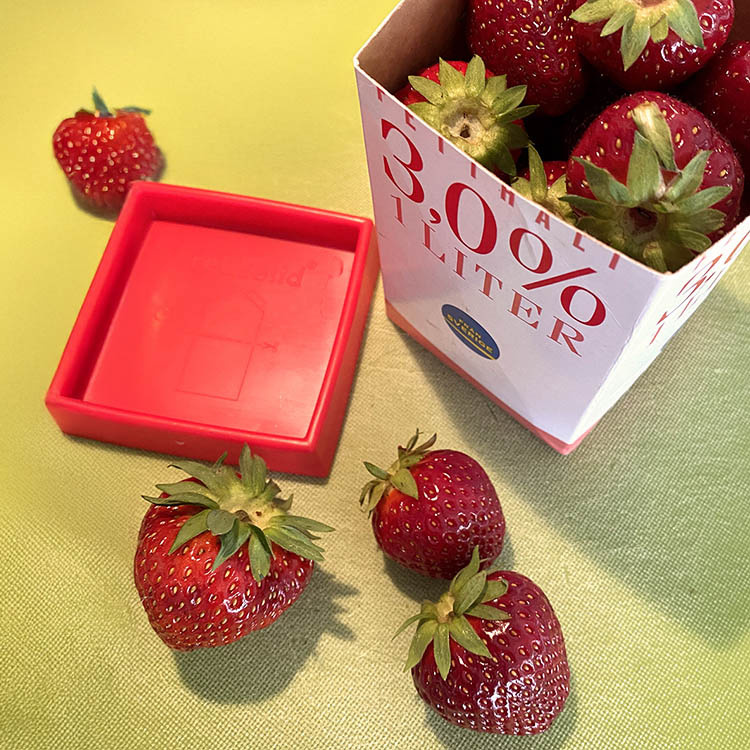 Rinse out the carton in warm water with a bit of dish soap and let it drain. Then open the top to create a straight edge and cut the carton to the height you want. Next, choose a lid: blue lid for cartons with a flat top and red lid for cartons with a pointed top.For dry goods, it's advisable to let the carton dry completely inside before filling. When storing in the fridge, you can conveniently label the carton with contents and date. When the carton becomes worn, recycle it, keep the lid, and use it on a new, clean carton.