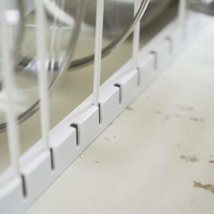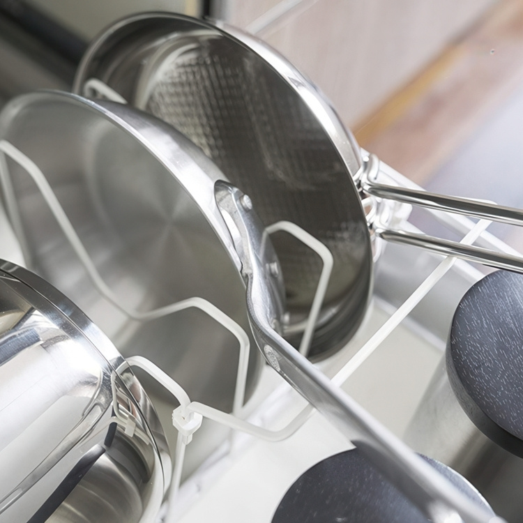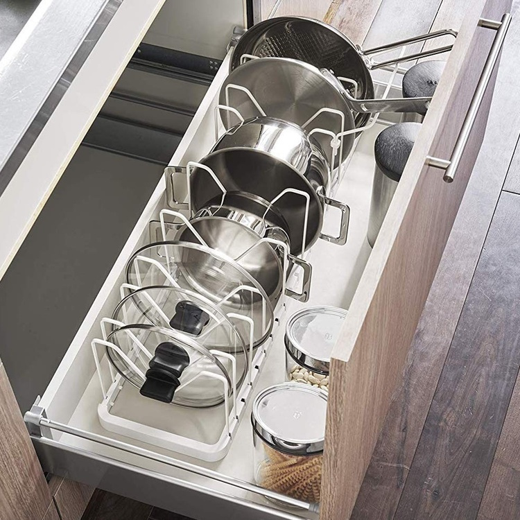 Whether used on sliding shelves, in cupboards or on the countertop, the rack ably wrangles unruly cookware.