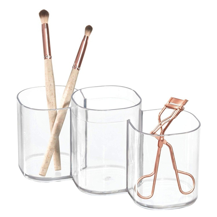 Three plastic cups perfect for holding lip glosses, brushes, makeup applicators, mascaras, eyeliners, eyeshadow brushes, q-tips, and more. -