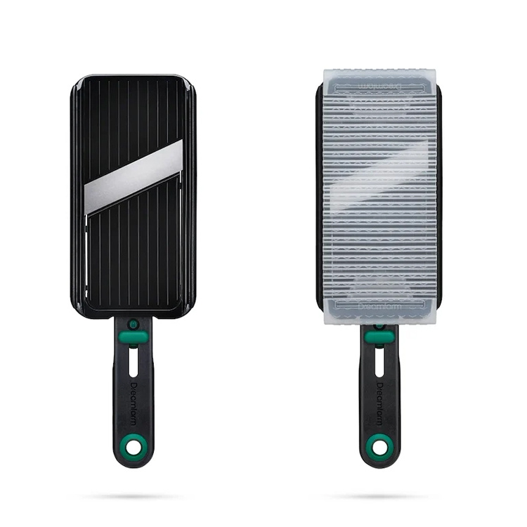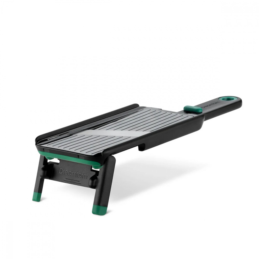 Mandolin Dreamfarm is a smart and safe tool in the kitchen that combines a sharp japanese steel blade with a unique finger guard. The guard has a flexible shape and allows you to cut raw materials down to the last piece without risking your fingers. The foldable foot provides a stable grip against the counter and the thickness can be chosen between 1, 2 and 3 mm. When the work is done, you lock the blade and click on the guard – ready for safe and smooth storage.