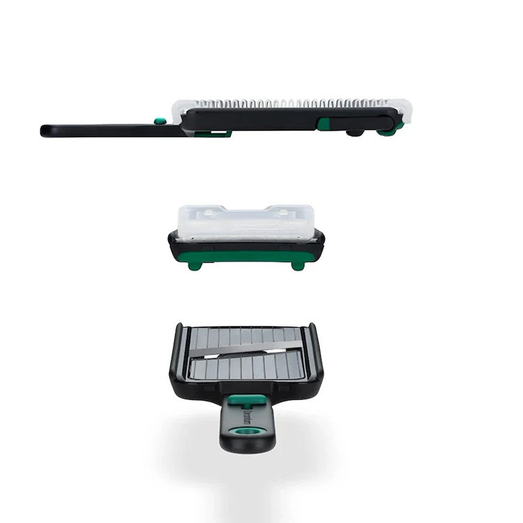 The built-in, non-slip foot can be folded out and lifts the mandoline making it easy for slices to slide down into a bowl or directly into the pot without getting stuck. The compact shape and smart construction make it easy to handle and store.Specifications