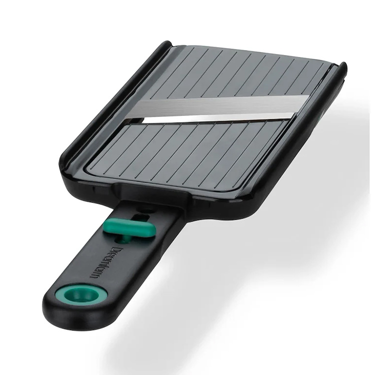 The blade is made of japanese stainless steel and can be adjusted to cut slices in three fixed thicknesses: 1 mm, 2 mm, and 3 mm. A perfect tool in the kitchen for slicing potatoes, cucumbers, or onions. When you’re not using the mandoline, the blade can be locked for safe storage. The mandoline is made of BPA-free plastic and is dishwasher safe.Flexible finger guard